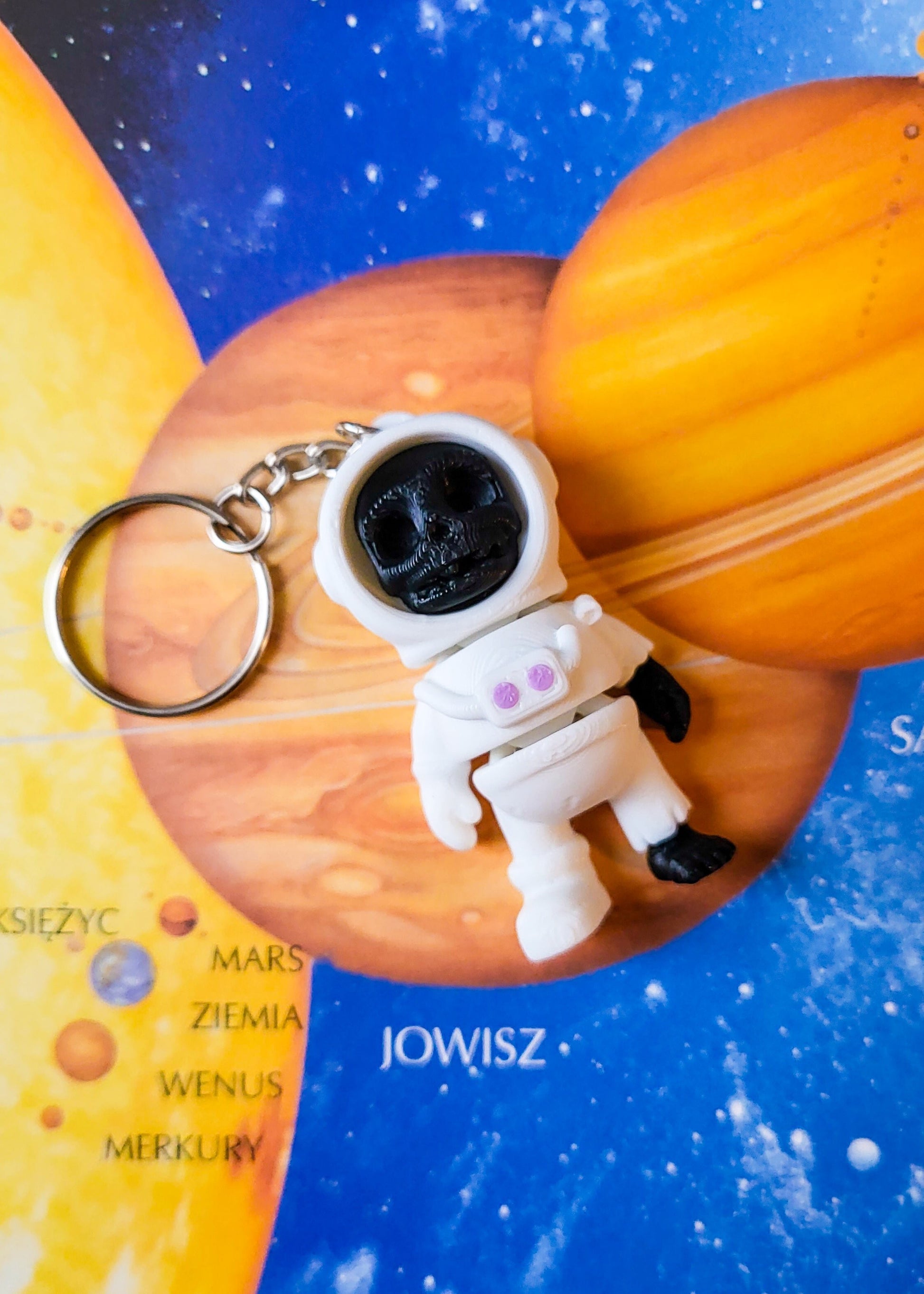 Oto unikalny brelok astronauty zombie wydrukowany w 3D – idealny gadżet dla fanów sci-fi i horroru! Ta miniaturowa figurka przedstawia kosmonautę z niepokojącymi, „zombie” detalami: jego kombinezon jest podniszczony, a z kasku widać oczodoły. Figurka breloka jest kompaktowa, lekka i ma mocowanie do kluczy lub plecaka. Dla fanów kosmosu, postapokaliptycznych klimatów i unikalnych dodatków to prawdziwy hit!