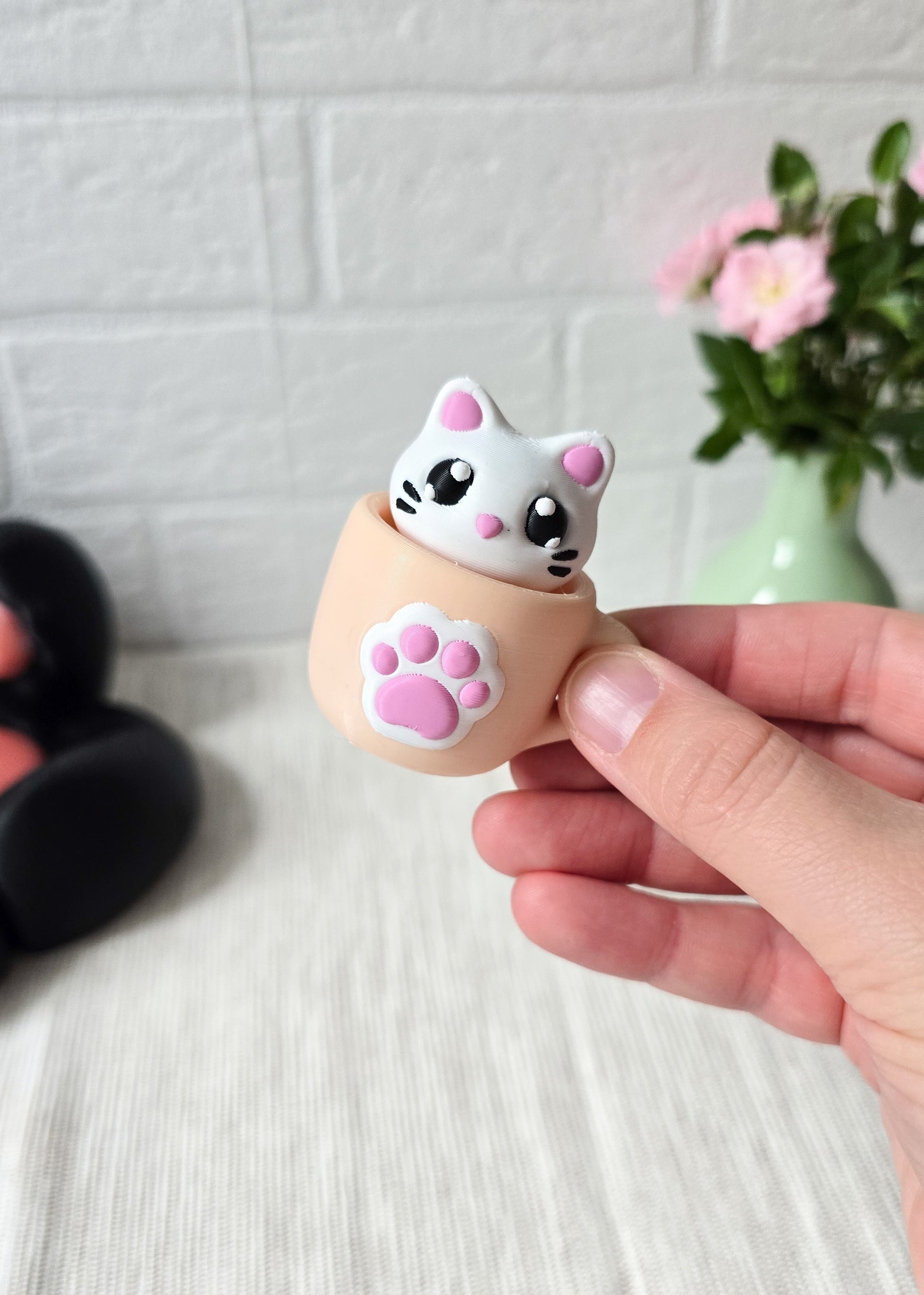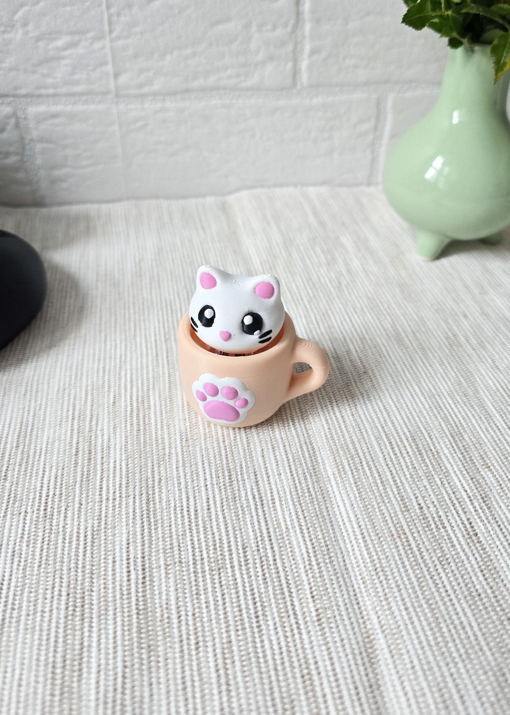 Uroczy kliker antystresowy w kształcie filiżanki z wystającą główką kotka to gadżet, który od razu wywołuje uśmiech! Drukowany w technologii 3D, zachwyca starannym wykonaniem i słodkim detalem – kotek wygląda tak, jakby zaglądał z ciekawością z wnętrza kubeczka. Kliker kocia filiżanka to połączenie relaksującej funkcji antystresowej z wyjątkowym designem. Jest lekki, wygodny w użyciu i idealny do codziennego użytku – w pracy, w szkole czy w podróży.