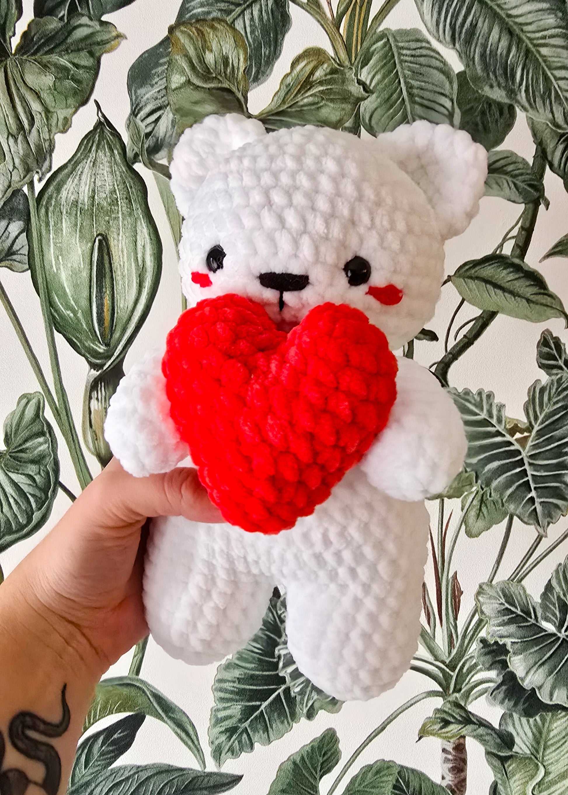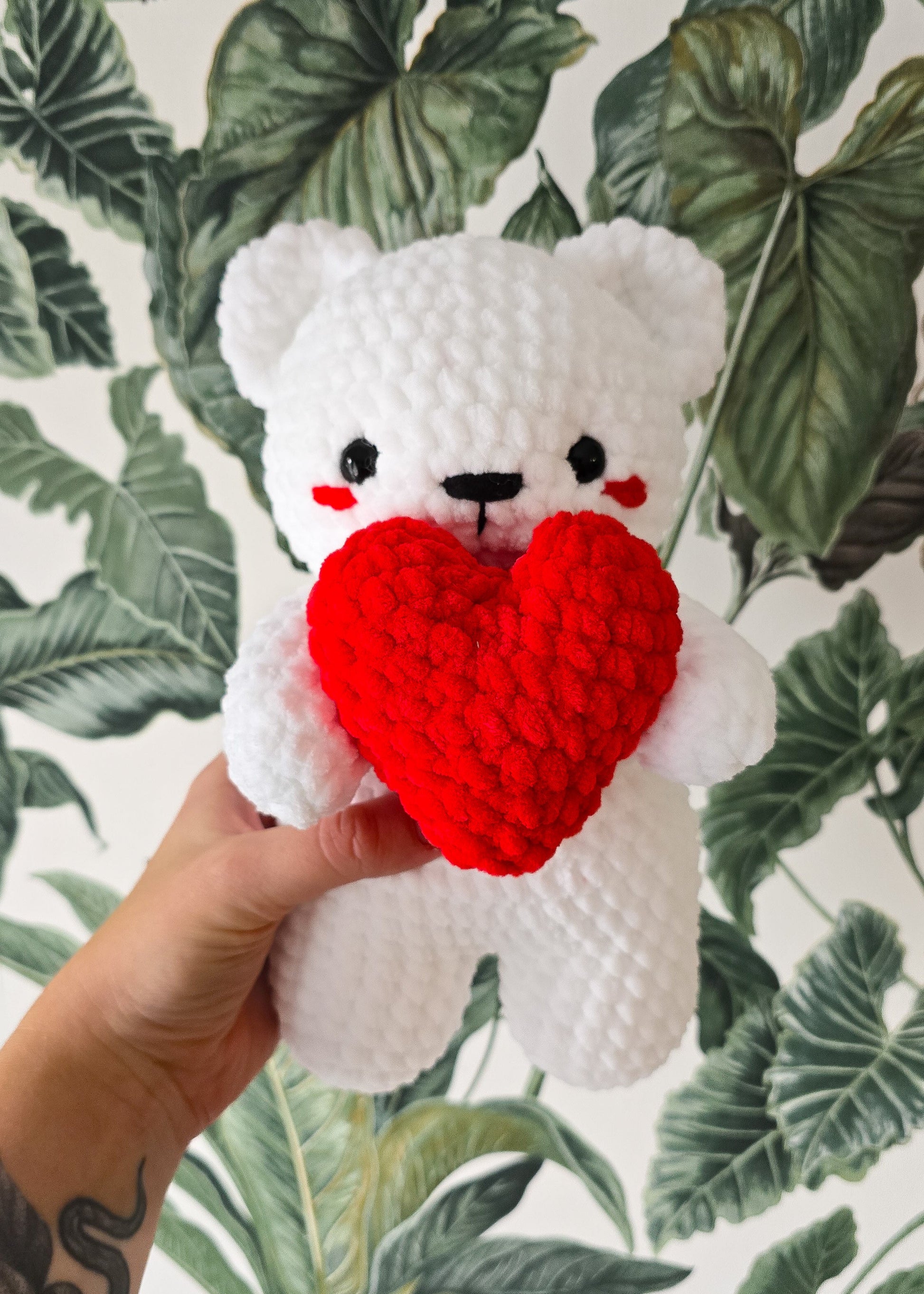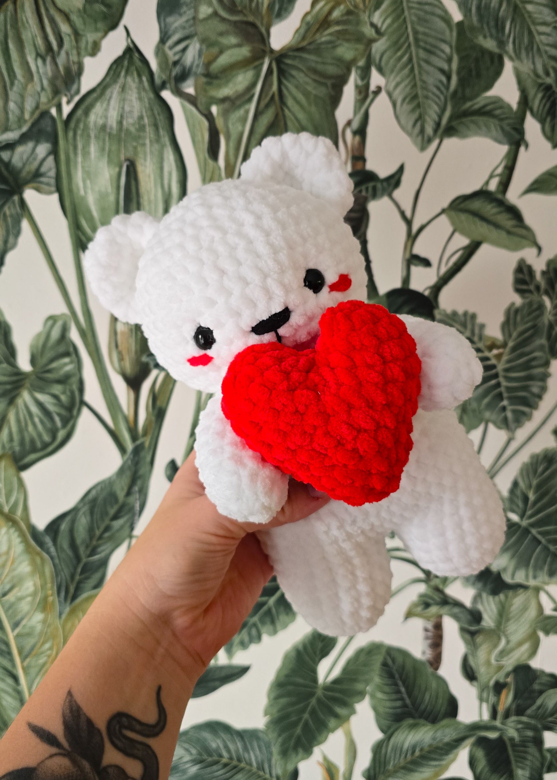 Uroczy biały miś z czerwonym sercem w łapkach to ręcznie wykonana szydełkowa przytulanka, która zachwyca swoim ciepłem i wyjątkowym urokiem. Miękka w dotyku i lekka, została stworzona z wysokiej jakości, bezpiecznych dla dzieci włóczki, co sprawia, że jest idealnym towarzyszem do tulenia i zabawy.