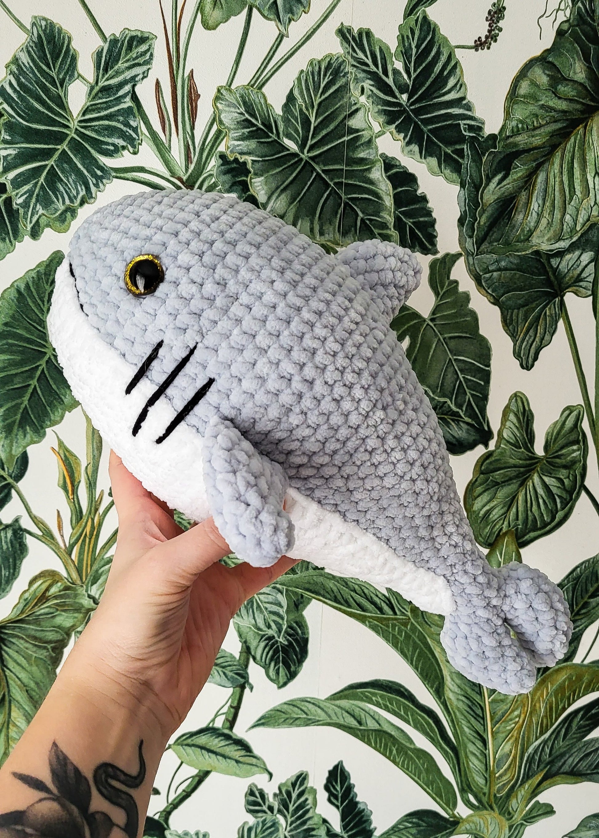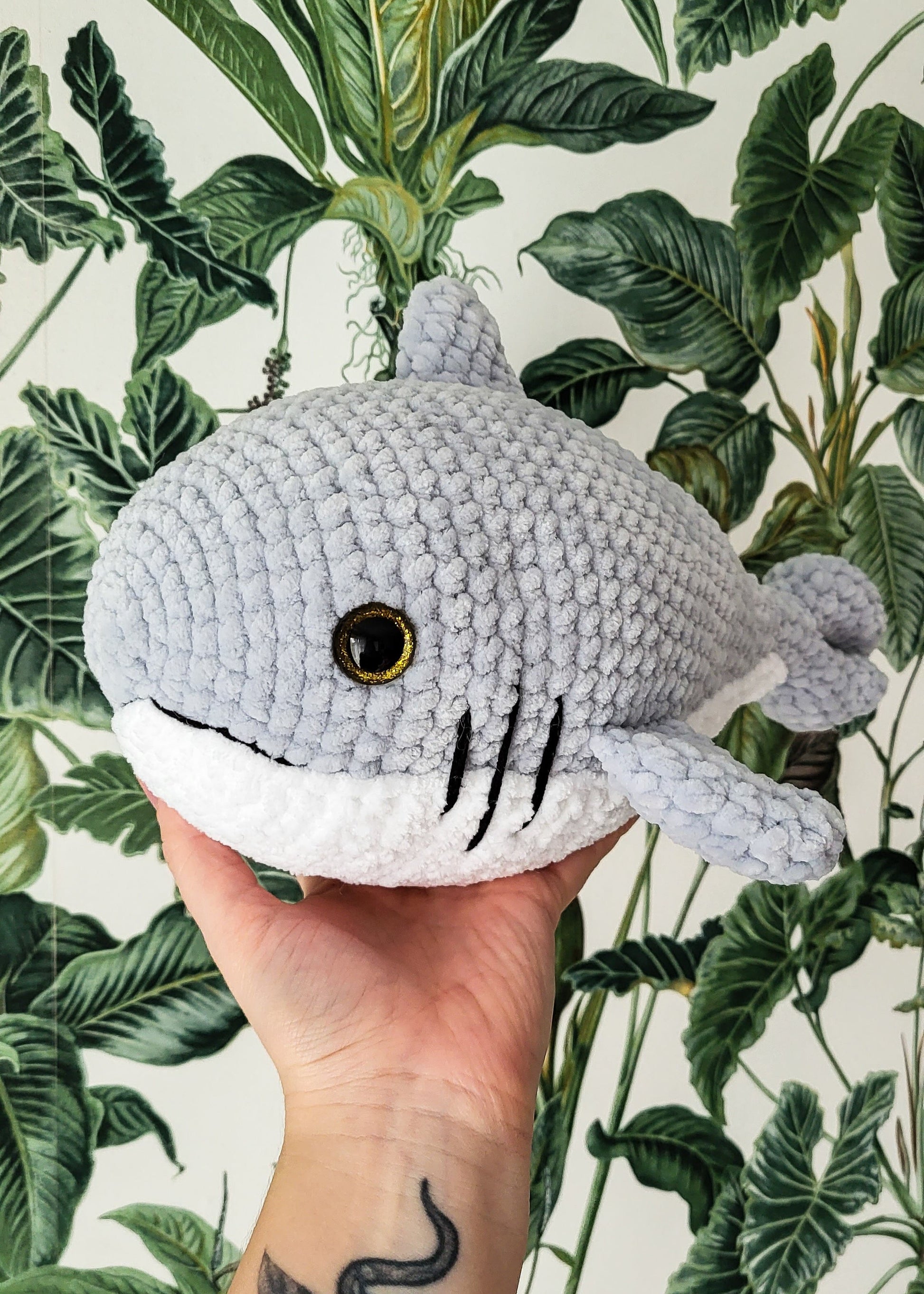 Ten ręcznie robiony rekin zachwyca swoją precyzją wykonania. Wykonany z bezpiecznej, miękkiej włóczki, jest idealny dla dzieci do zabawy i przytulania, a także jako niebanalna dekoracja pokoju. Ta szydełkowa maskotka rekina to wyjątkowy pomysł na prezent dla małych miłośników morskich stworzeń i fanów rękodzieła. Doskonały do tulenia, jak i zabaw z wyobraźnią!