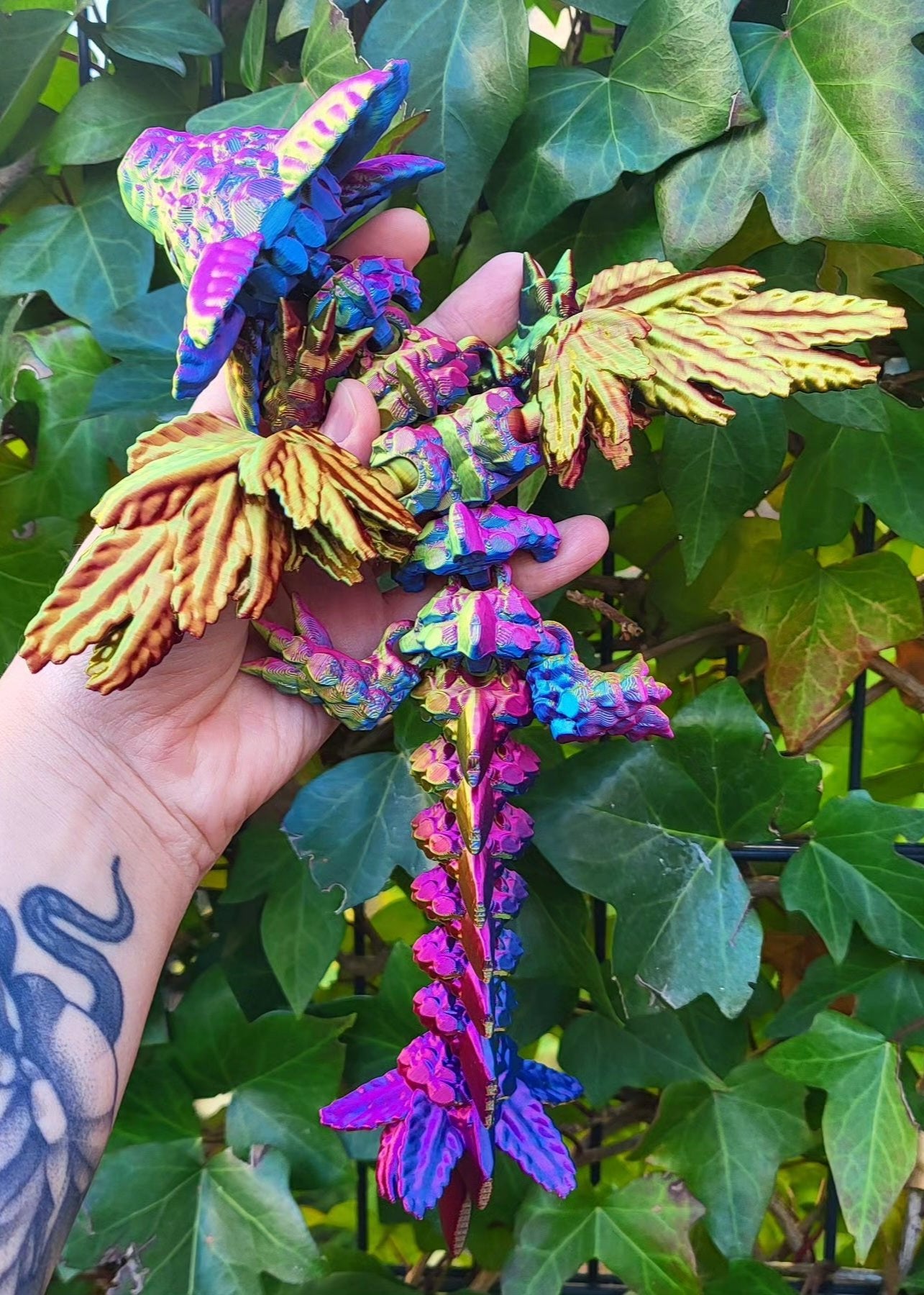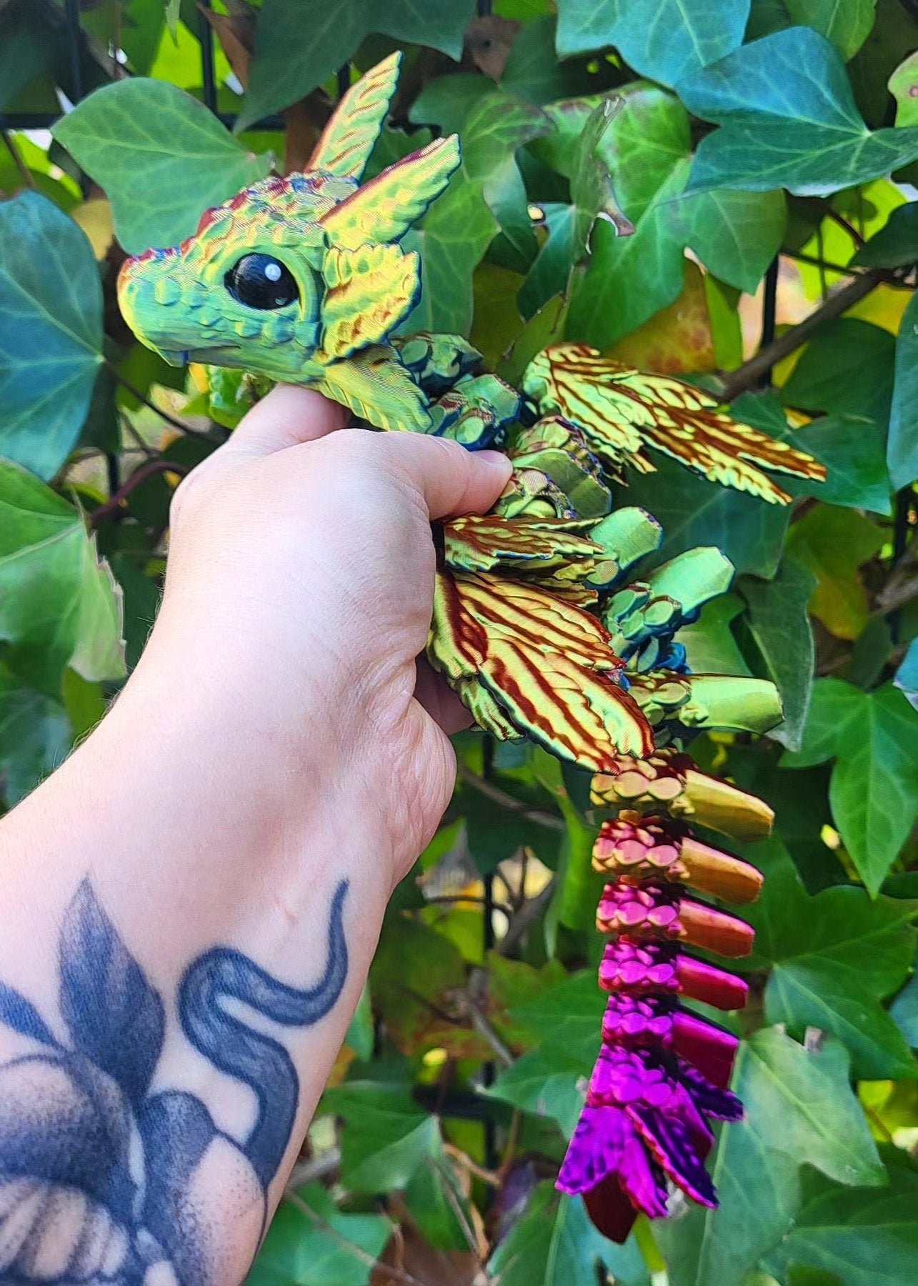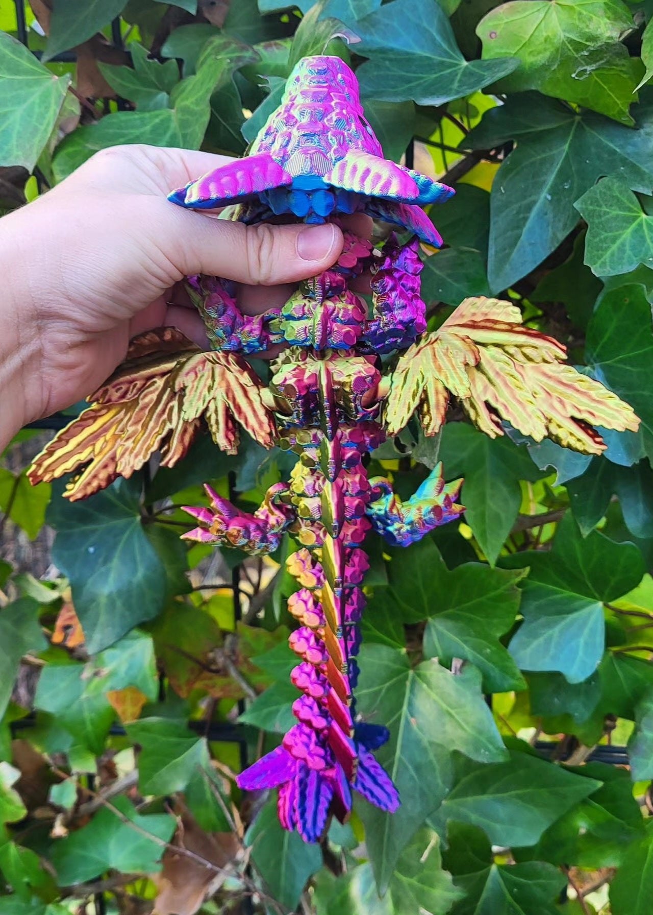 Odkryj mistyczną figurkę 3D smoka z pięknymi rozkładanymi skrzydłami, która ma w sobie ogromną siłę! Smok mieni się mnóstwem kolorów od złota, poprzez róż aż po zieleń i fiolet. Dzięki precyzyjnej technologii druku 3D każda część figurki została starannie odwzorowana. Idealna jako ozdoba lub niepowtarzalny prezent dla miłośników smoków.