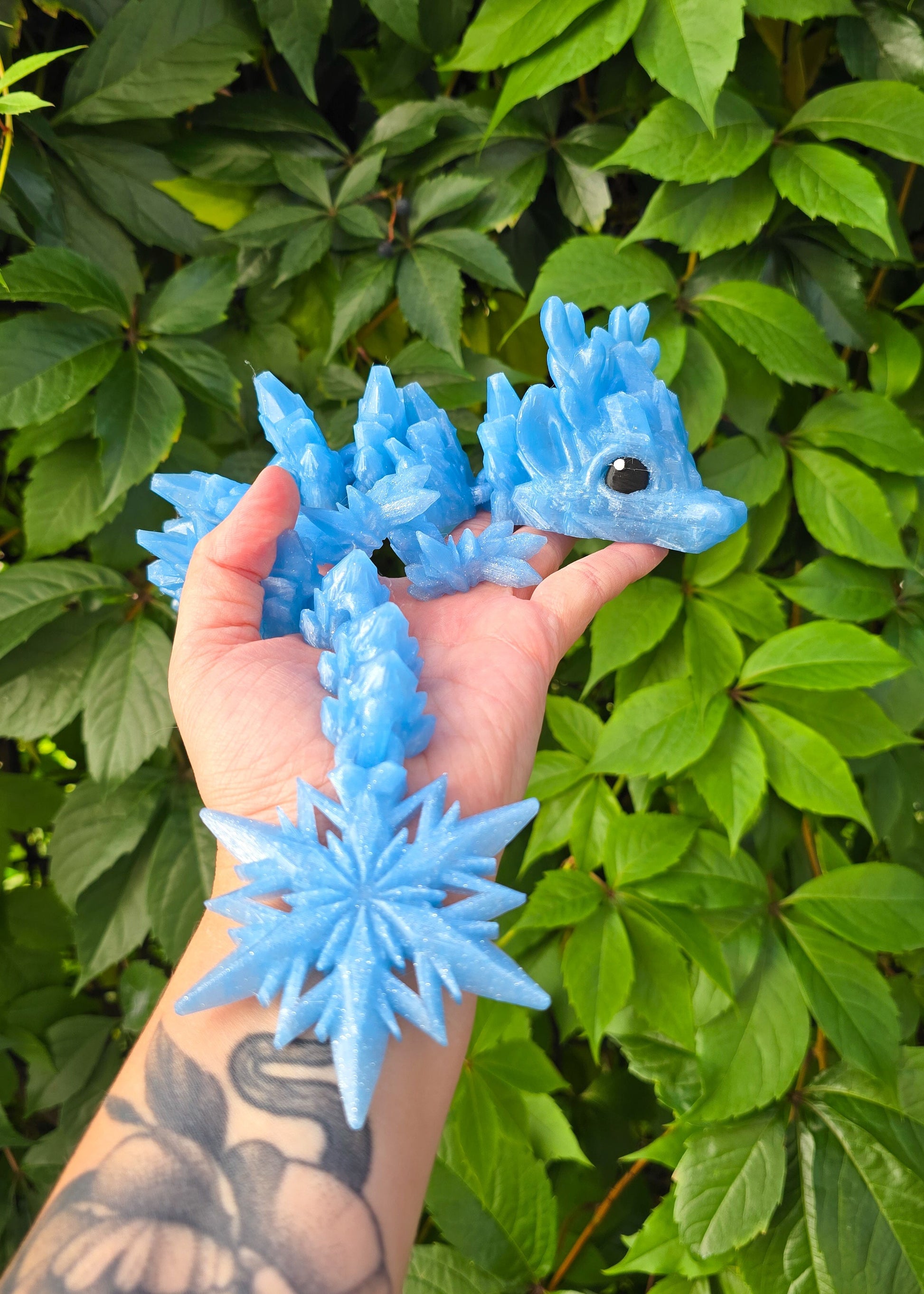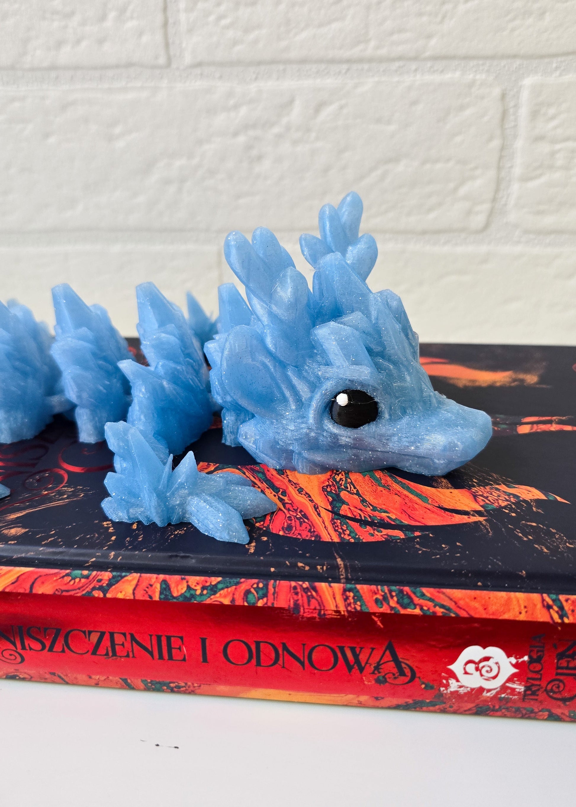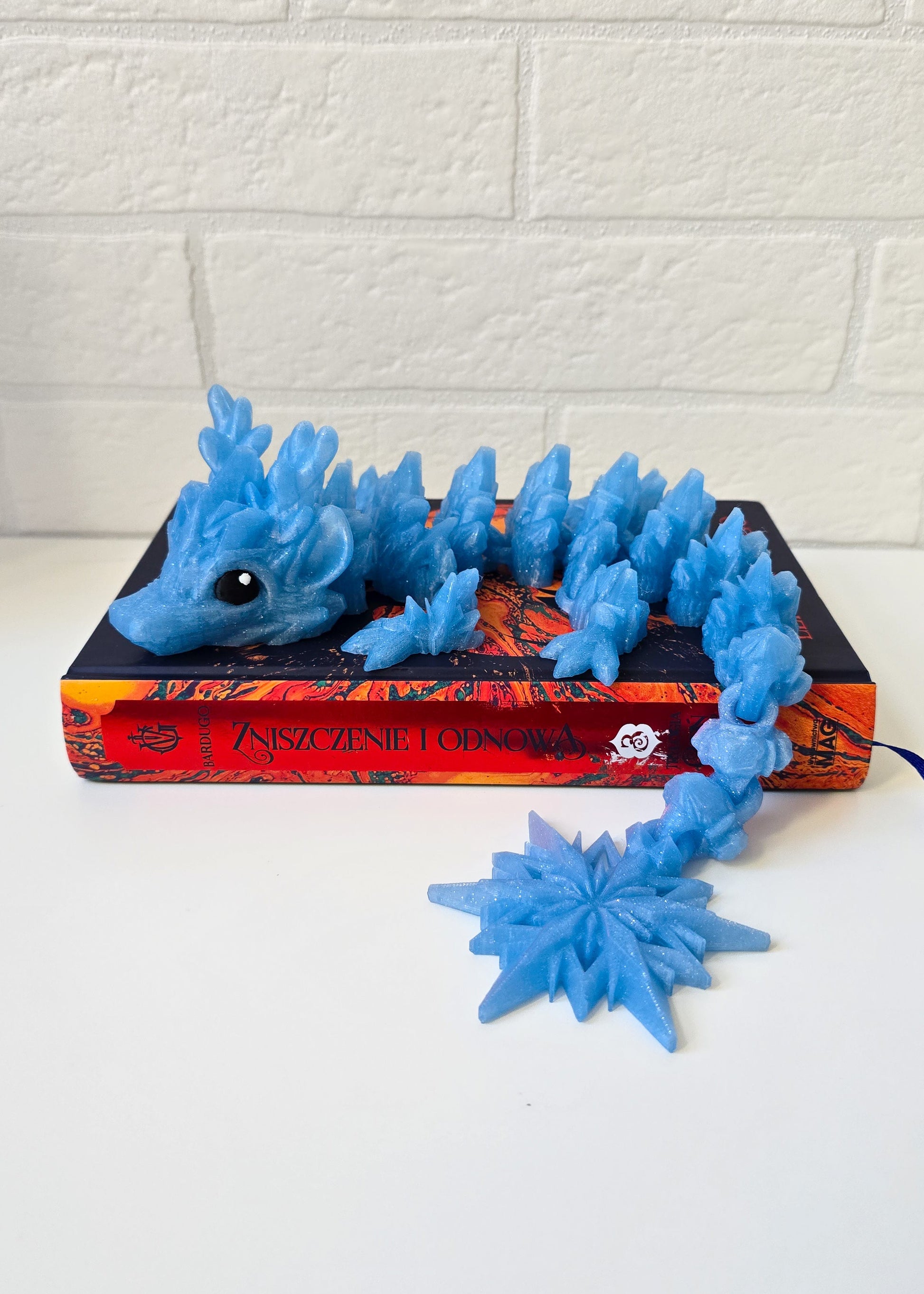 Oto imponująca figurka smoka wydrukowana w 3D, w pięknym błękitnym kolorze z detalami przypominającymi lodowe akcenty. Całość wygląda, jakby smok pochodził prosto z krainy lodu! Na końcu długiego ogona znajduje się szczegółowa śnieżynka, co dodaje figurce zimowego, magicznego charakteru. To doskonały wybór dla kolekcjonerów, miłośników fantasy i wszystkich, którzy szukają wyjątkowego dodatku do swojego wnętrza!
