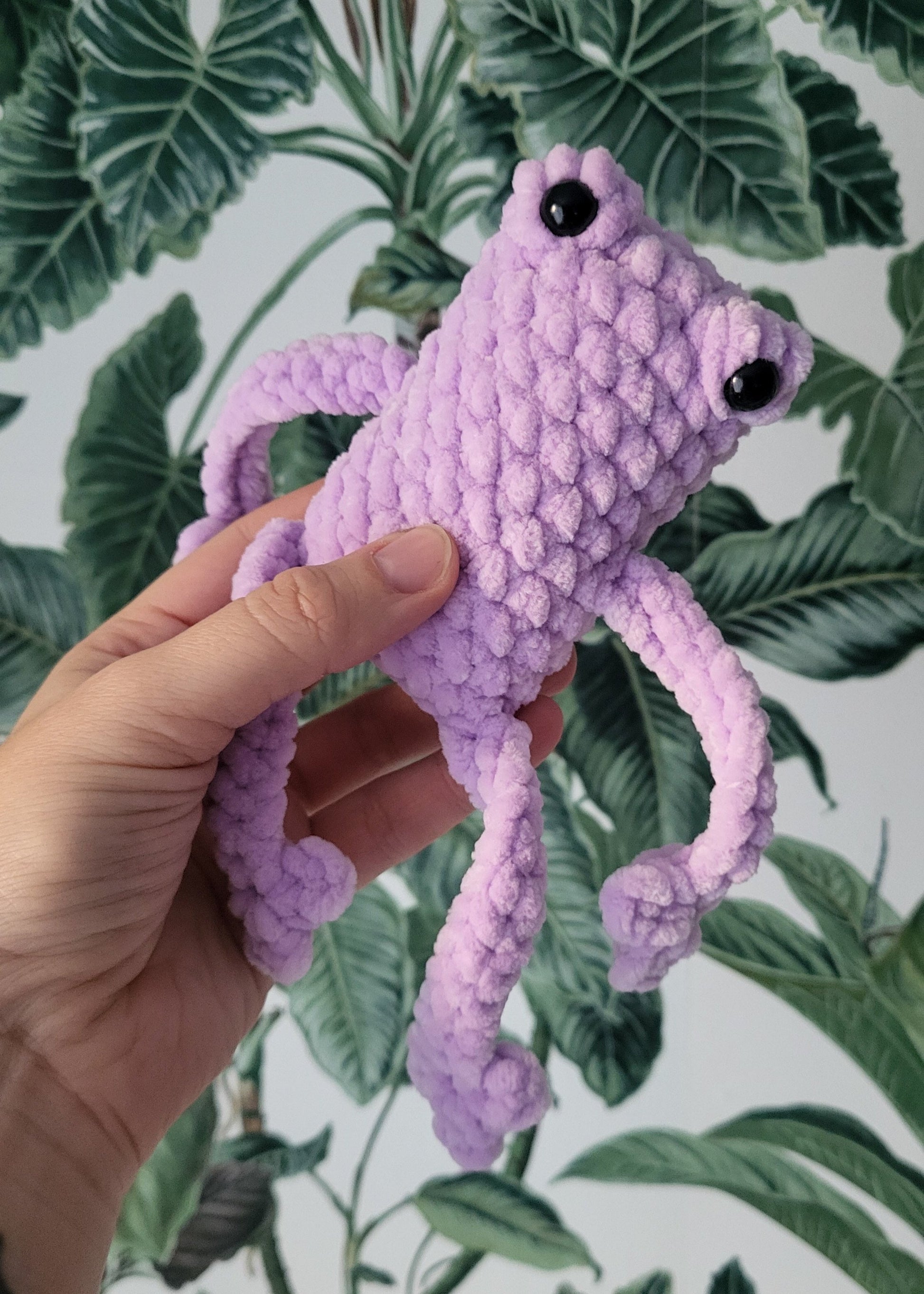 Przedstawiamy zabawną szydełkową żabkę, która doda radości i uśmiechu do każdego wnętrza! Ta urocza żabka, wykonana z miękkiej włóczki, wyróżnia się wiszącymi rękami i nogami, co sprawia, że jest nie tylko przytulanką, ale także interaktywnym towarzyszem zabaw dla dzieci i dorosłych. Rechotka to idealny prezent dla małych odkrywców, którzy uwielbiają interaktywne zabawki.