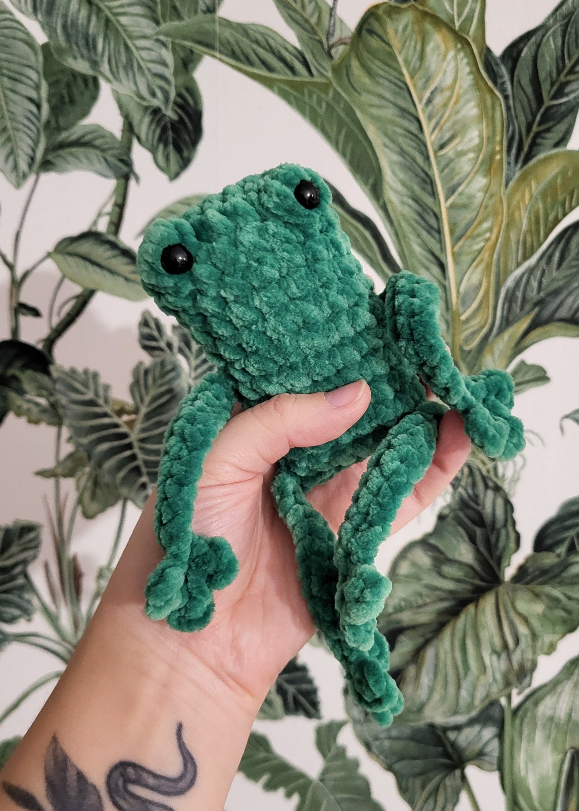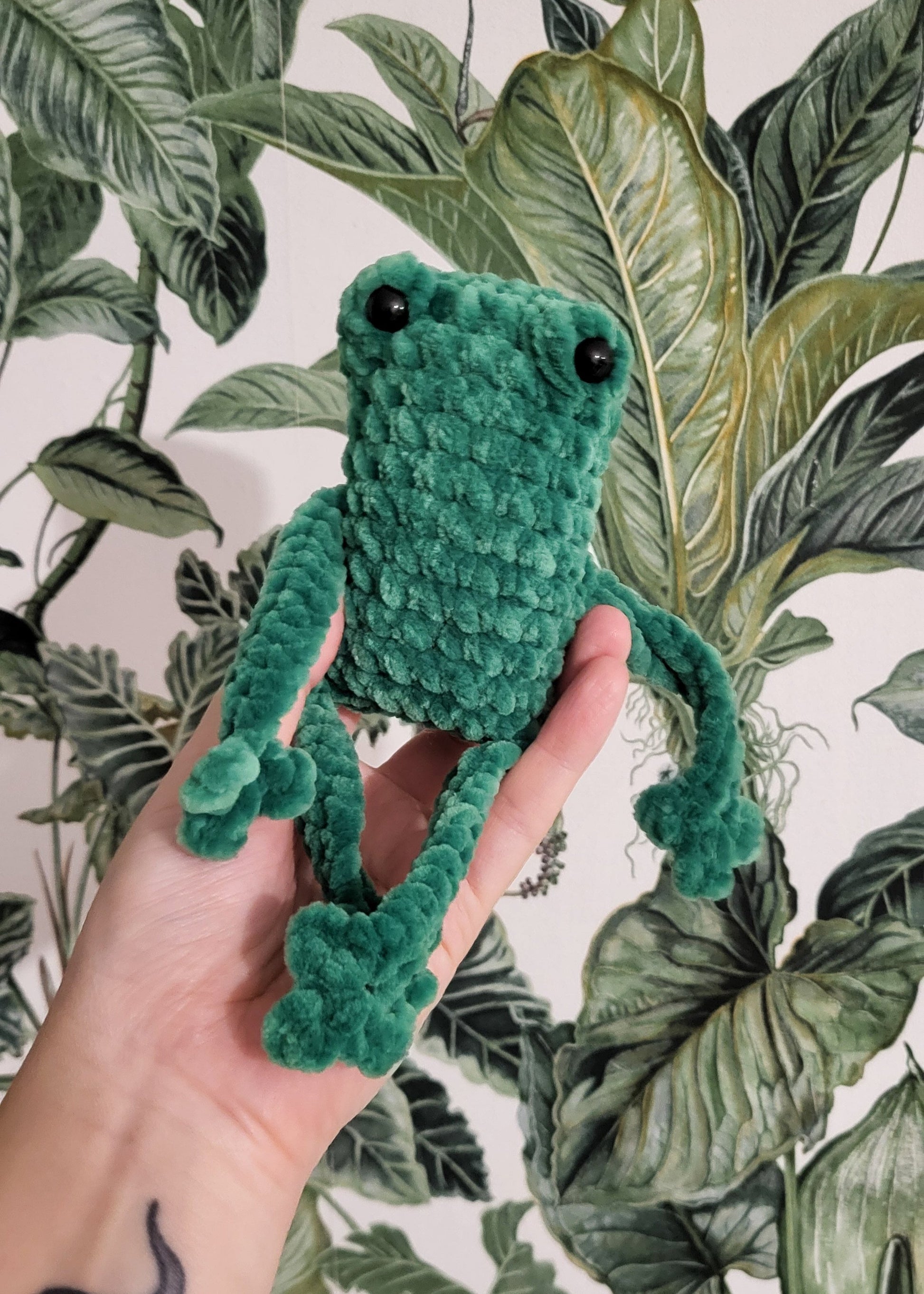 Przedstawiamy zabawną szydełkową żabkę, która doda radości i uśmiechu do każdego wnętrza! Ta urocza żabka, wykonana z miękkiej włóczki, wyróżnia się wiszącymi rękami i nogami, co sprawia, że jest nie tylko przytulanką, ale także interaktywnym towarzyszem zabaw dla dzieci i dorosłych. Rechotka to idealny prezent dla małych odkrywców, którzy uwielbiają interaktywne zabawki.