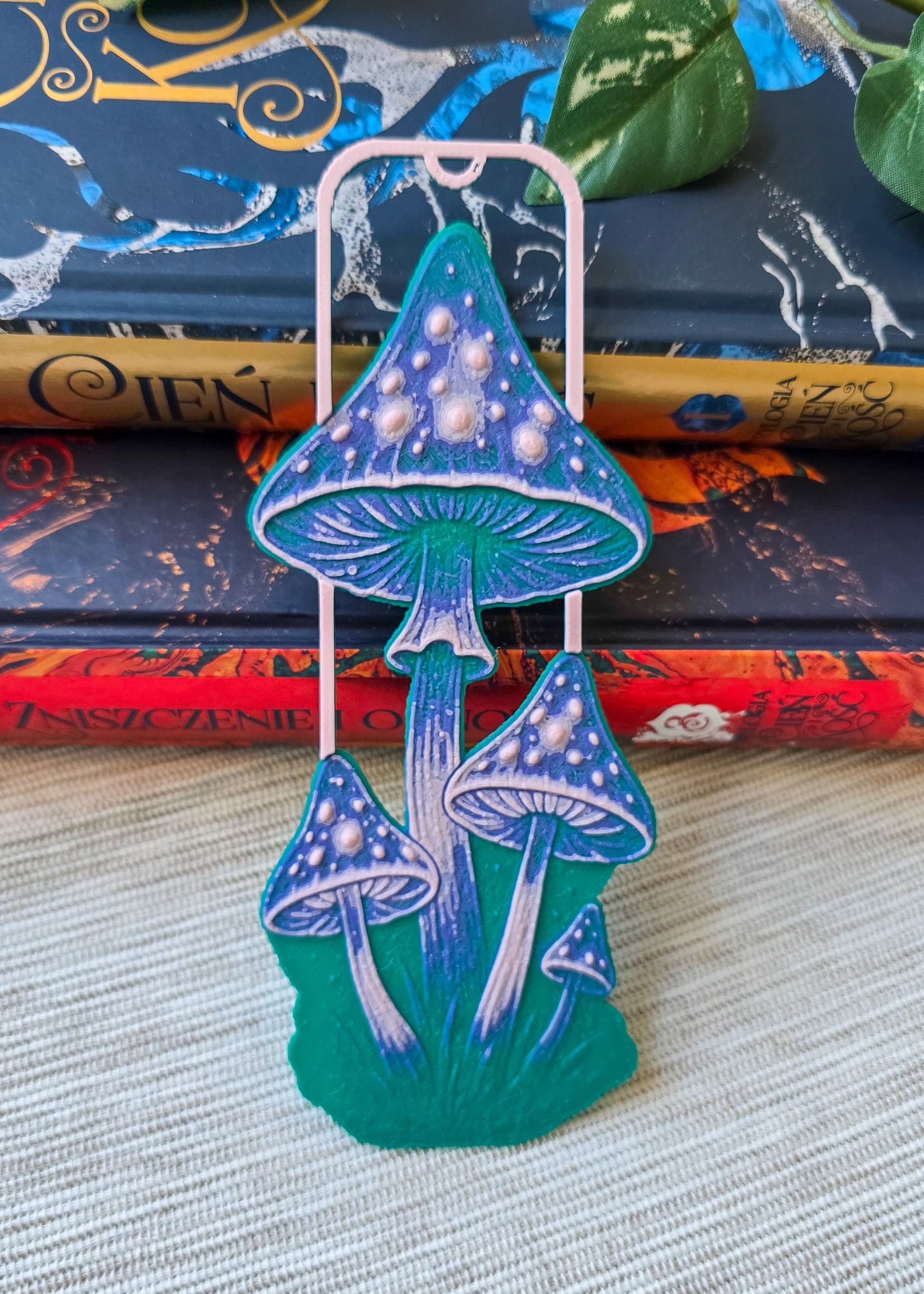 Baśniowa zakładka do książki z motywem magicznego grzyba, zaprojektowana i wykonana metodą druku 3D. Motyw grzyba kojarzy się z lasem, magią i światem fantasy, dzięki czemu zakładka idealnie pasuje do książek fantasy, baśni i opowieści pełnych wyobraźni 📚🌲
